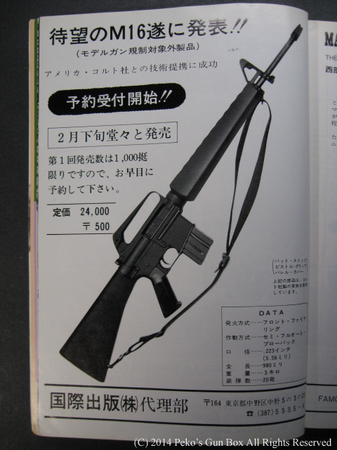 M16のモデルガンは確か国際出版から1973年ごろに発売されたのが初めてだったと思います。 実銃のバットストック、ピストルグリップ、ハンドガードが付けられていたそうですが、もちろん私には高くて到底買えない代物でした。 これはその後マルシンの金属M16A1に引き継がれたようですね。 当時の¥24000はとてもとても高嶺の花で中学生だった私には¥3800だったハンドガンもなかなか手が出なかったのを覚えています。(笑) |