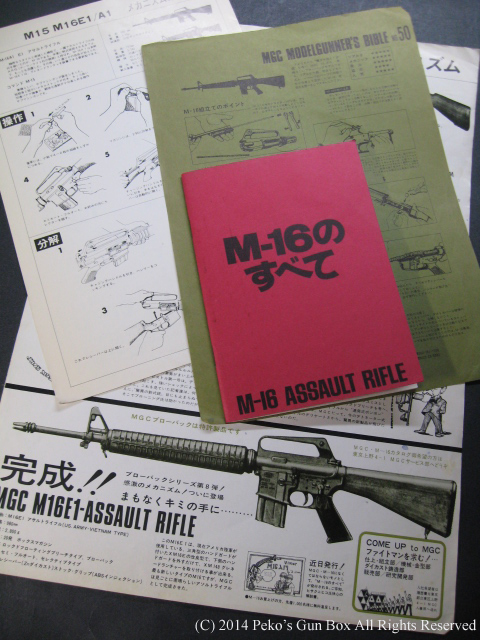 その後、M16A1になるわけですが、MGCのM16A1と言えば特徴的なフォワードアシスト風の分解用でっぱりが特徴になっていますね! 当時はハリウッド映画でもベトナム戦争の映画に発砲しないシーンでよく登場しました。 もちろんガン・レンタル会社のギボンズにもたくさんのMGC製M16を見かけました。 1980年代にプラ製のM16A1が出るまでは日本でもTV、映画で代表的なM16だったですね。 ちなみによく書かれていますが、MGCの金属M16は実銃よりも重いです!(笑) | |