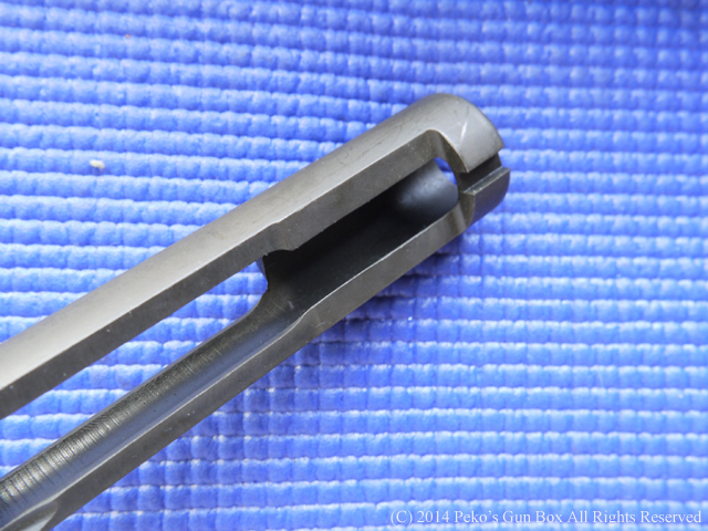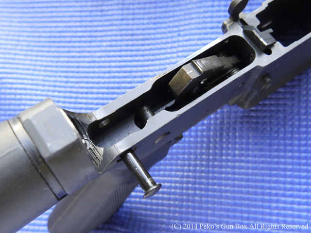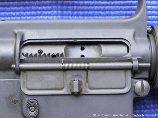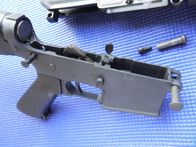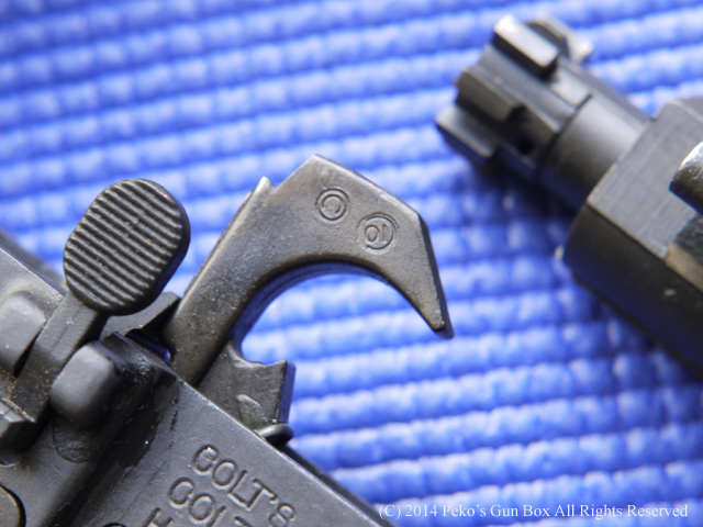 AR15/M16系のメカニズムはいまさら書くまでもなく皆さんよくご存知だと思うので書きませんが(いや、書くのが面倒だから!笑)少しだけこのSP1について書きますと、AR15 SP1はセミオート・オンリーなわけですが、ただフルオート・シアが付いていないだけではなく、フルオート・シアにかかわる部分、トリガー、ハンマー、フック、セフティーレバーなどフレームに入っているパーツのほとんどに交換、または削り取ってフルオート・シアに届かないようになっています。 それは、ボルトキャリヤーにもおよび、シアがあたる部分を削り取ってあります。 | |