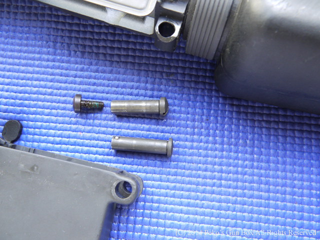 まだコルト社だけがAR15を製造していたころは、M16との互換性をなくす為、マガジン・ハウジングの前側のピンのサイズを大きくしてM16の物と合わない様にされていました。 しかし社外製のアッパーフレームがたくさん出回るようになるとそれと組み合わせられるように専用のピンも販売されていました。(社外のパーツはM16を基準に作られていましたから!) コルト社製のAR15はヒンジのピンがスクリューなのでMP5のような横から差し込むだけのピンも売られていました。 | |