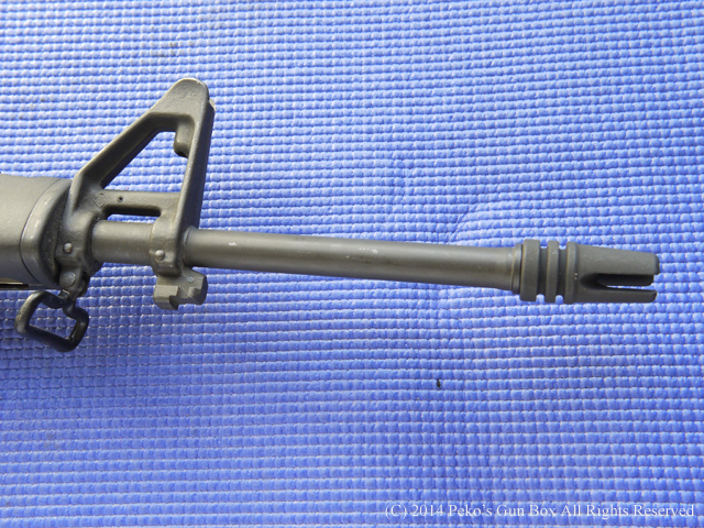 AR15 SP1は1963年から1984年まで生産されました。 初期のものと後期のものでは刻印が少し違います。 ここにあるのは後期のもので、初期のものはフラッシュ・ハイダーが三つ又であること、バット・プレートにクリーニング・キットなどを入れるストレージがないことなどでこの後期モデルはシリアルナンバーから1981年製とわかります。 フラッシュ・ハイダーはA1用のバード・ケイジでフォワード・アシストが付いていないにもかかわらず、ボルト・キャリヤーにギザギザが付いています。 このAR15が作られた時期はもうM16A1に移行された後なので部品を共用としたのでしょう。 | |