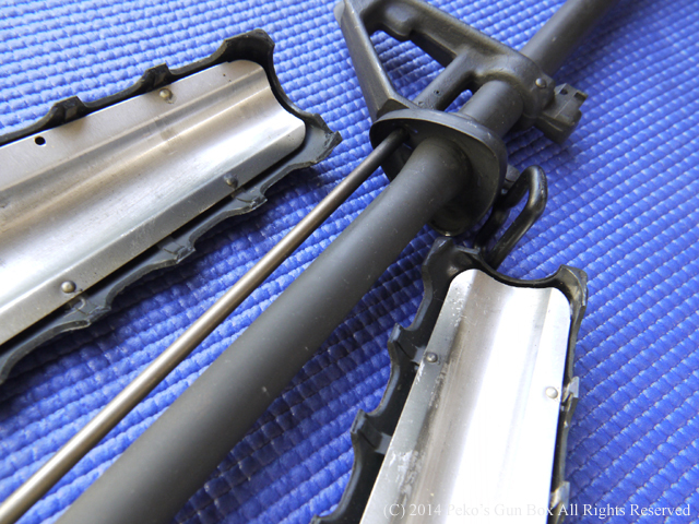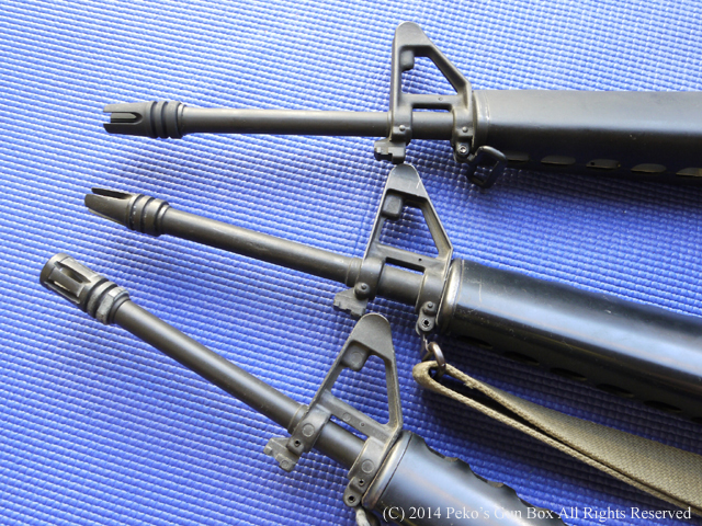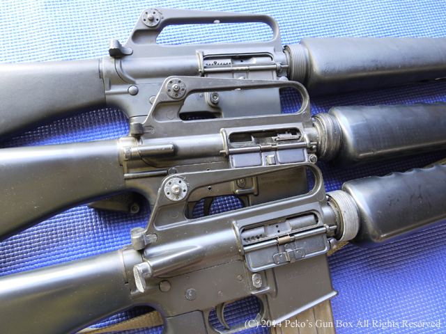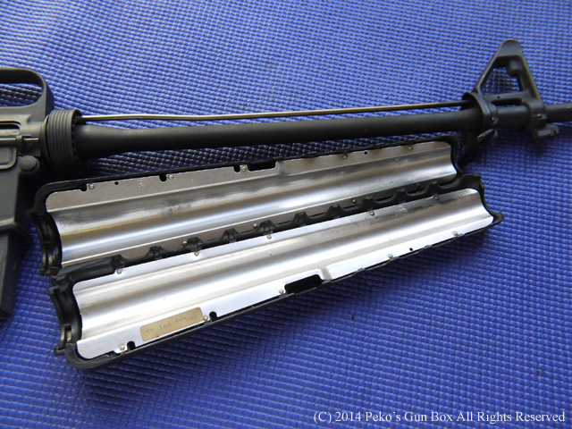 最近のM4系に代表されるハンドガードのレールに色々な物がついたライフルを見慣れている私にはこの三角のハンドガードが付いたAR15が懐かしいと言うよりなぜか新鮮に見えます。(笑) | |
