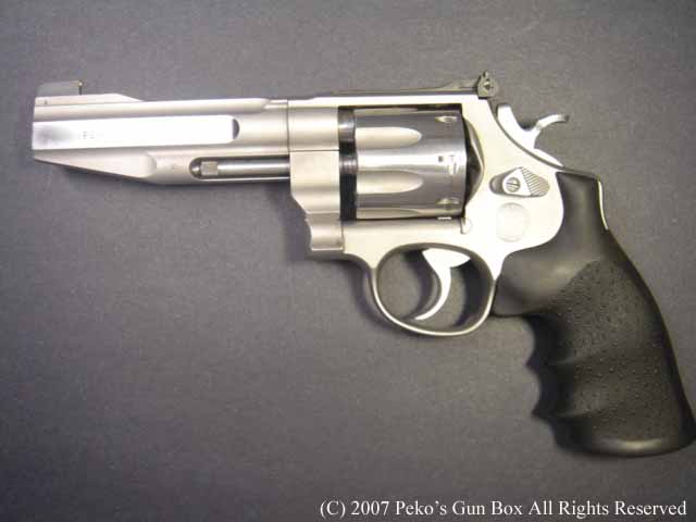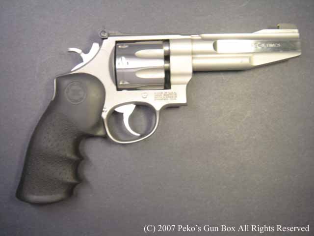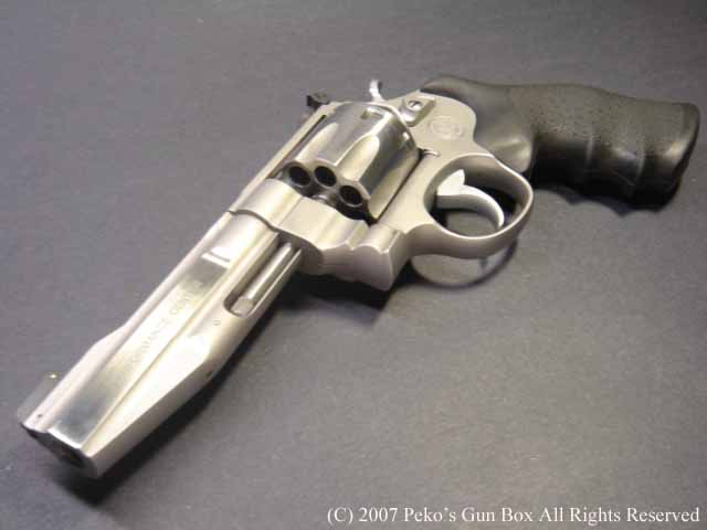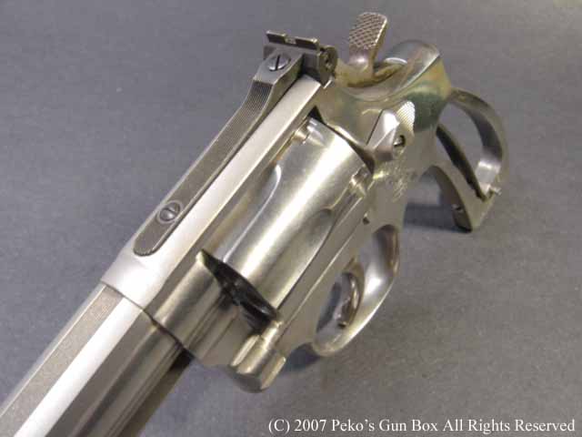 このM627PCは、最近売られているS&Wのリボルバーと同じようにフレーム・トップのリヤ・サイトの先端が丸くなって少し短くなっており、エレベーション・スクリューのところの幅が少し広くなっています。 そして、今のS&Wのリボルバーはすべてラウンド・バットになってしまいました。 このM627−PCもNフレームで5インチ・バレルですが、ラウンド・バットとなっています。 | |