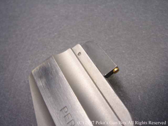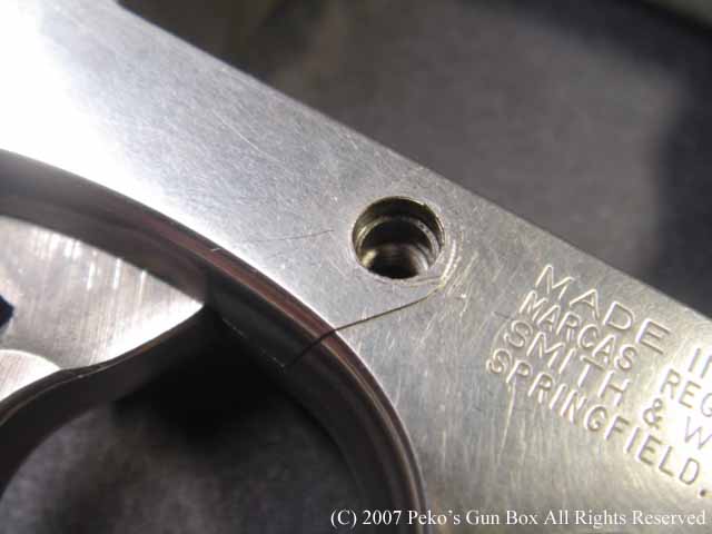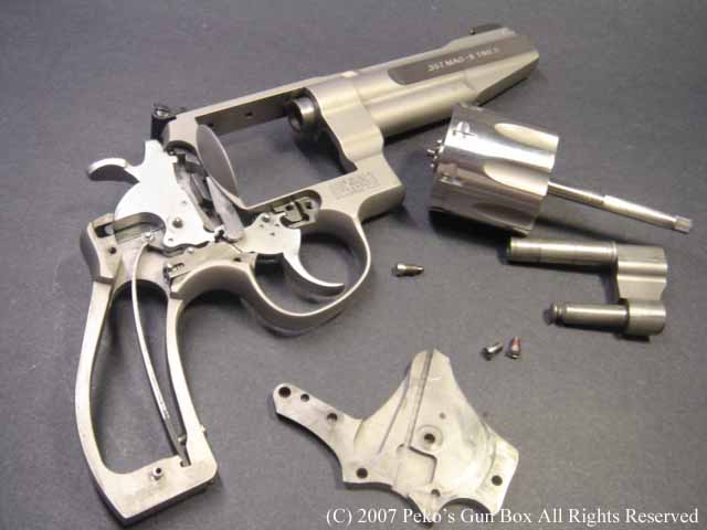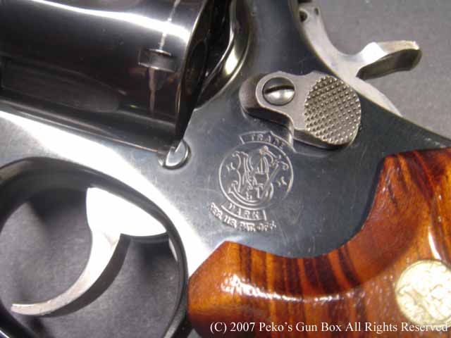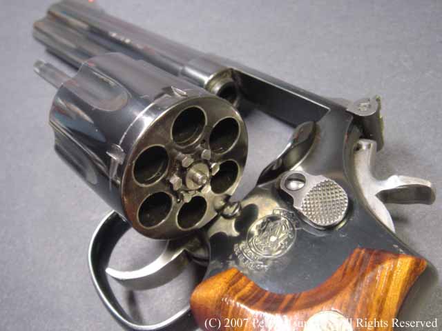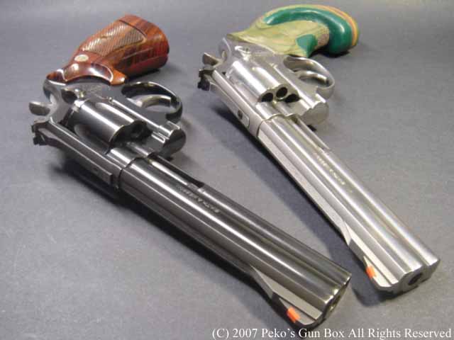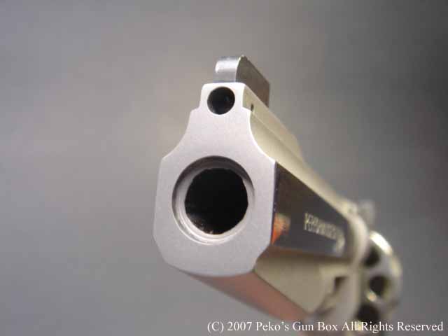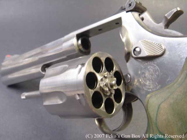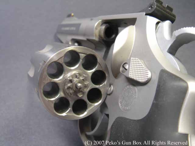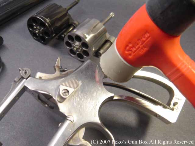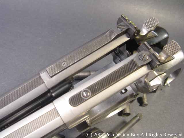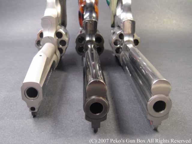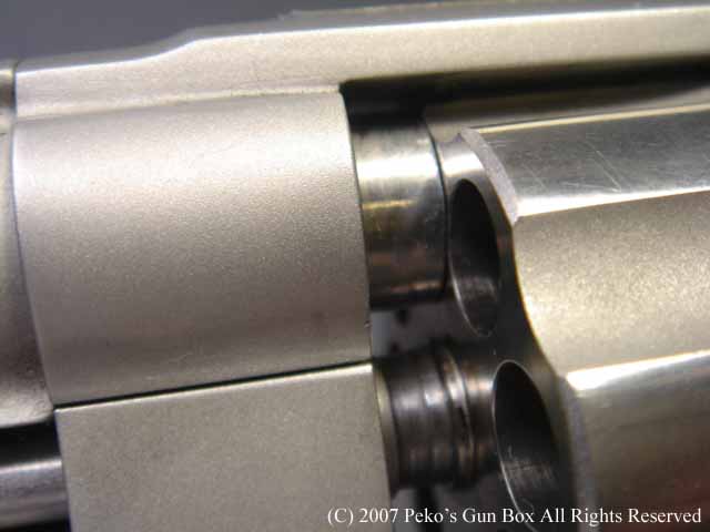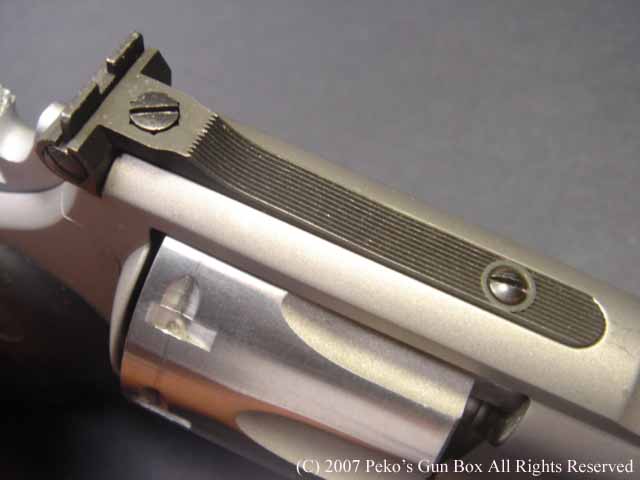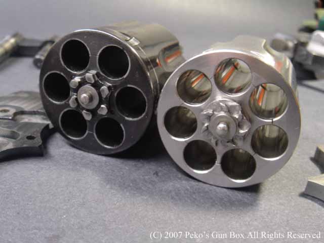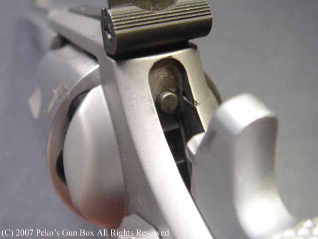 しかし、8連発が普通のラインナップに入れられないのは、8連発のシリンダーにすることによって8発のシリンダーの穴が通常の6連発のものより少し外側へオフ・セットしているのでバレルも上に少しずらさなければならないのと、それに伴ってファイアリング・ピンも上へずらすことになり、ハンマーにではなくフレームに上にオフセットして付けられているセミ・カスタムになっているからなのです。 | |