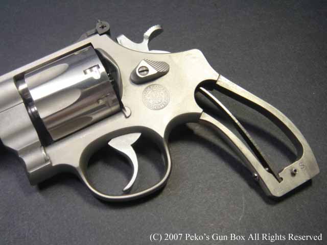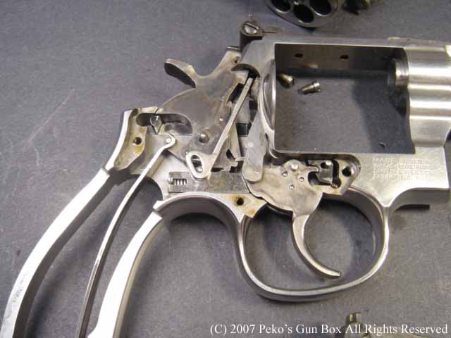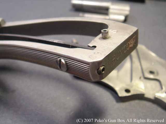 このM627にはハンマー・スプリングを留めているスクリューをロックするスクリューが追加されています。 通常、このスクリューを緩めることによってハンマースプリングのテンションを下げ、トリガーを軽くすると思いがちですが、スクリューと言うのは撃っているうちに緩んでくるものなのでみんな硬く締めておかなければなりません。 ですからスプリングのテンションを弱めるためにはスクリューの長さを短くして調整するのが本当なのです。 それを簡単に行えるようにこのガンはカスタムしてあるわけです。 |