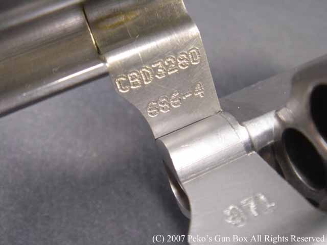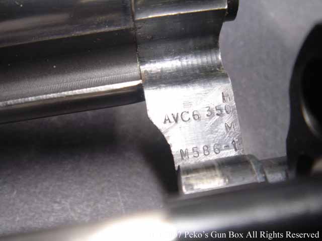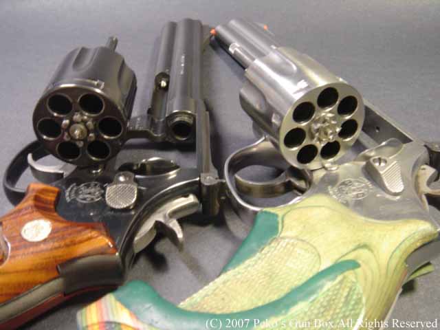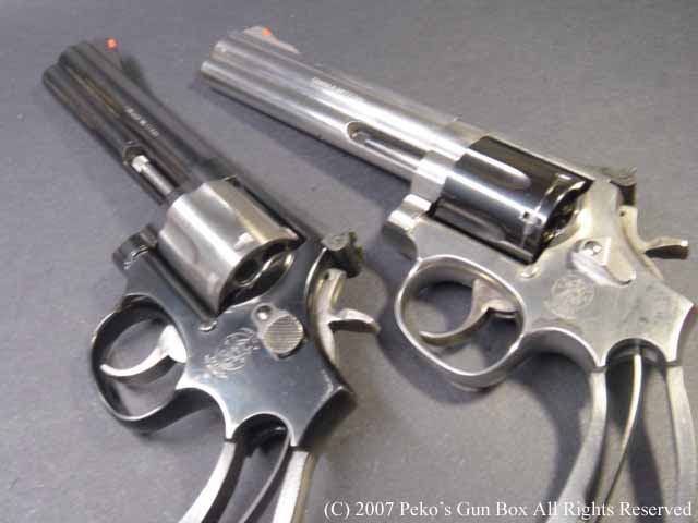 ゲストのM686ですが、これは刻印を見るとM686−4となっています。 M686Plus と言いまして、1発多い7発装弾できるシリンダーが付いています。 このガンもM627−PCと同じくフレーム・トップはリヤ・サイトの先端が丸くなっており、グリップ・フレームもラウンド・バットになっています。 もう1つのゲスト、こちらはM586−1です。 これはもうLフレーム最初のリボルバーで、皆さんモデルガンでおなじみのものですね。 こちらはもちろん6連発のシリンダーです。 | |
