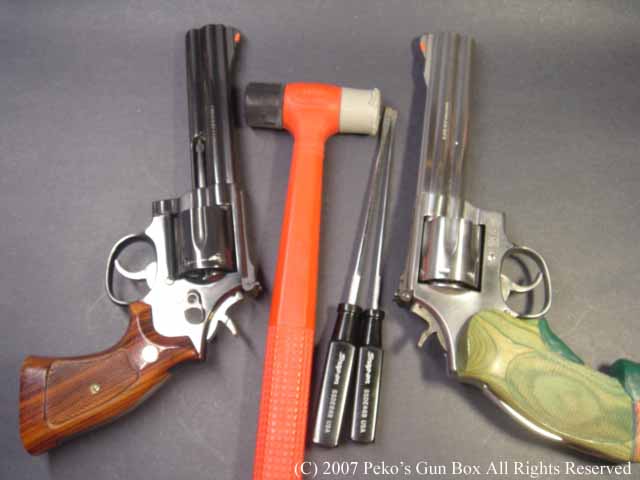 このM586とM686のサイド・プレートをはずしてみます。 用意するのはスクリューのサイズにピッタリ合ったスクリュー・ドライバー(ネジ回し)とプラスティック・ハンマーです。 ドライバーのサイズが合ってないとスクリューにダメージを与えてしまいます。 ハンドガンのスクリューはかなり硬く締まっています。 なぜなら、撃つ時の衝撃ですぐ緩んでしまうからです。 アメリカのインチ・サイズのスクリューなのでアメリカ製のスクリュー・ドライバーで緩めます。 グリップとスクリューが外れたらサイド・プレートをはずすのですが、見てのとおりピッタリ合わせてあるので引っぱり上げたくらいでは取れないのです。 こじってしまうと傷が付いてしまうので、ここはプラスティック・ハンマーかラバー・ハンマーでプレートのエンドの反対側をコンコンとたたくのです。 するとだんだん浮いてきてパラリと取れますので実銃を持っている方は試してみてください。(って、持っている人は少ないと思いますが・・・・・・。) | |