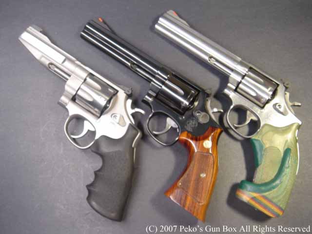 今回紹介するのは、これも預かり物のS&Wリボルバーでパフォーマンス・センターのNフレーム357マグナム8連発です。 どこでシリンダーの回転のタイミングを変えてあるのか少し興味があったのでシリンダーとシリンダー・ハンドの関係やトリガーを見てみようと思います。 と、言っても比べるNフレームの6連発がここにないので(すみません!)ゲストにM586の6連発とM686Plusと言うLフレーム7連発の2丁をちょっと比較に引っ張り出してきました。 | |