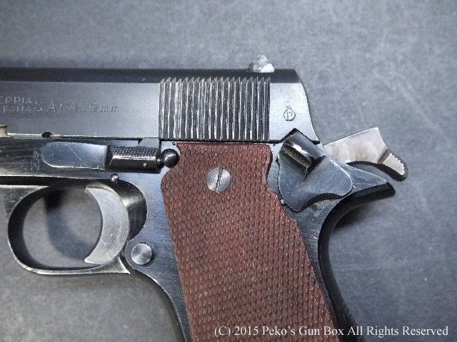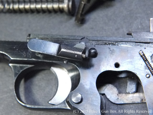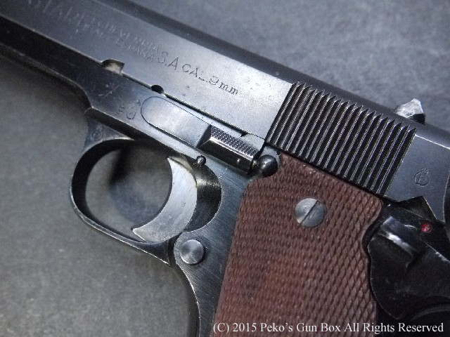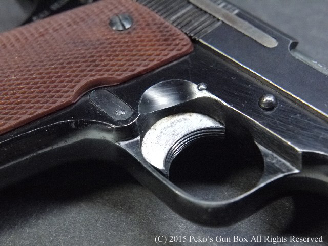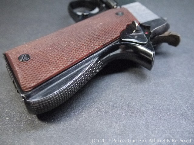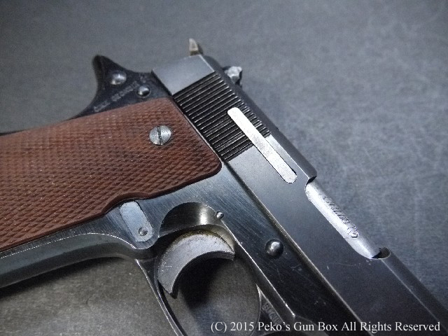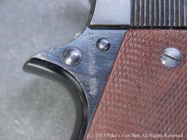 その他に1911ではグリップ上部にあるプランジャーがスライドストップの中に内蔵されている、セフティーレバーのプランジャーはなんとハンマーピンの中に内蔵されている、コック・アンド・ロックはもちろんですがハンマーダウンでもセフティーがかかる、 ディスコネクターがフレーム右側のスライドレール部分にある、ファイアリング・ピンをとめているピンがリヤサイトの下にある、と言った所でしょうか。 | |