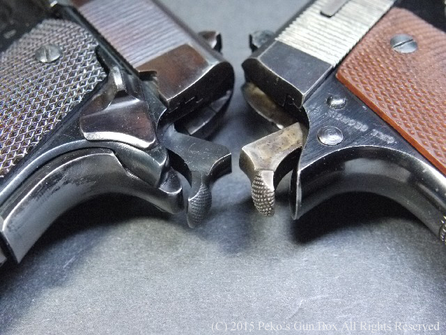 このスター・モデルBはスライド部分は半光沢のブルーでフレーム部分はポリッシュされた光沢のあるブルーで一種の2トーンのように見えます。 ガンプロではグリップが分厚くて大きいと書かれていましたが、実はフレームのグリップ部分は前後幅は1911とほとんど同じです。 フロントストラップのカーブの部分が少なく平面部分が広いのとその分グリップの幅が大きいので大きく見えるのでした。 メインスプリング・ハウジングにあたる所がアーチ形なので余計にそう感じますね! 実はハンマーの幅もスパーが短いだけでほとんど変わりません。 | |