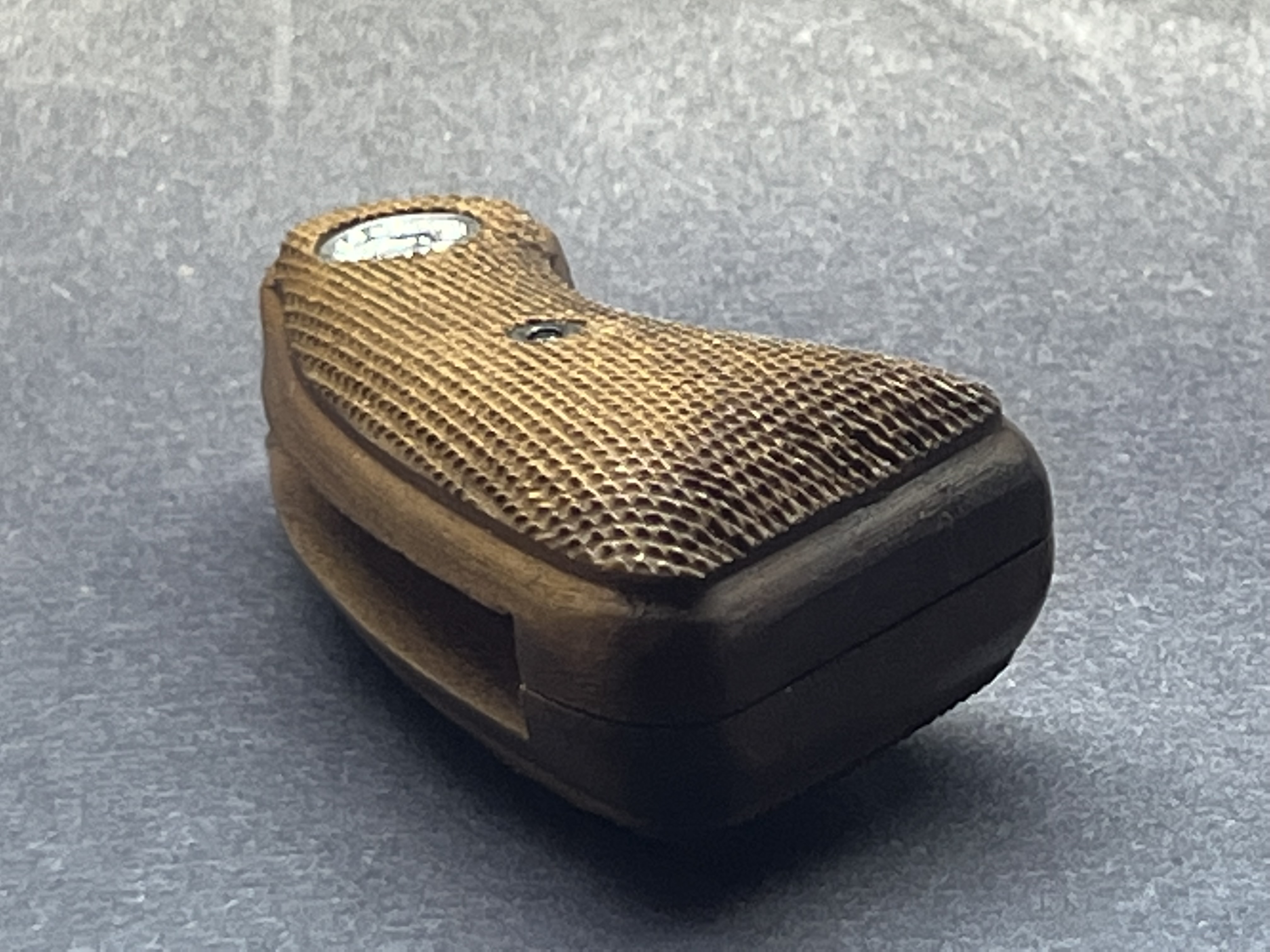 そして底にプレートが貼ってある説! 確かに貼ってあるようにも見えるのですが、手すりに置かれたガンの写真を露出を明るくしてみました。 私には底の真ん中に薄く線が見えるので左右のグリップの分かれ目と取りました。 つまりプレートではなくそういうデザインかと? ここにあるグリップも底をもうすこし平らに削ると同じようになるのではないかと思いました。 それはグリップの個体差なのか?とも思われます。 | |