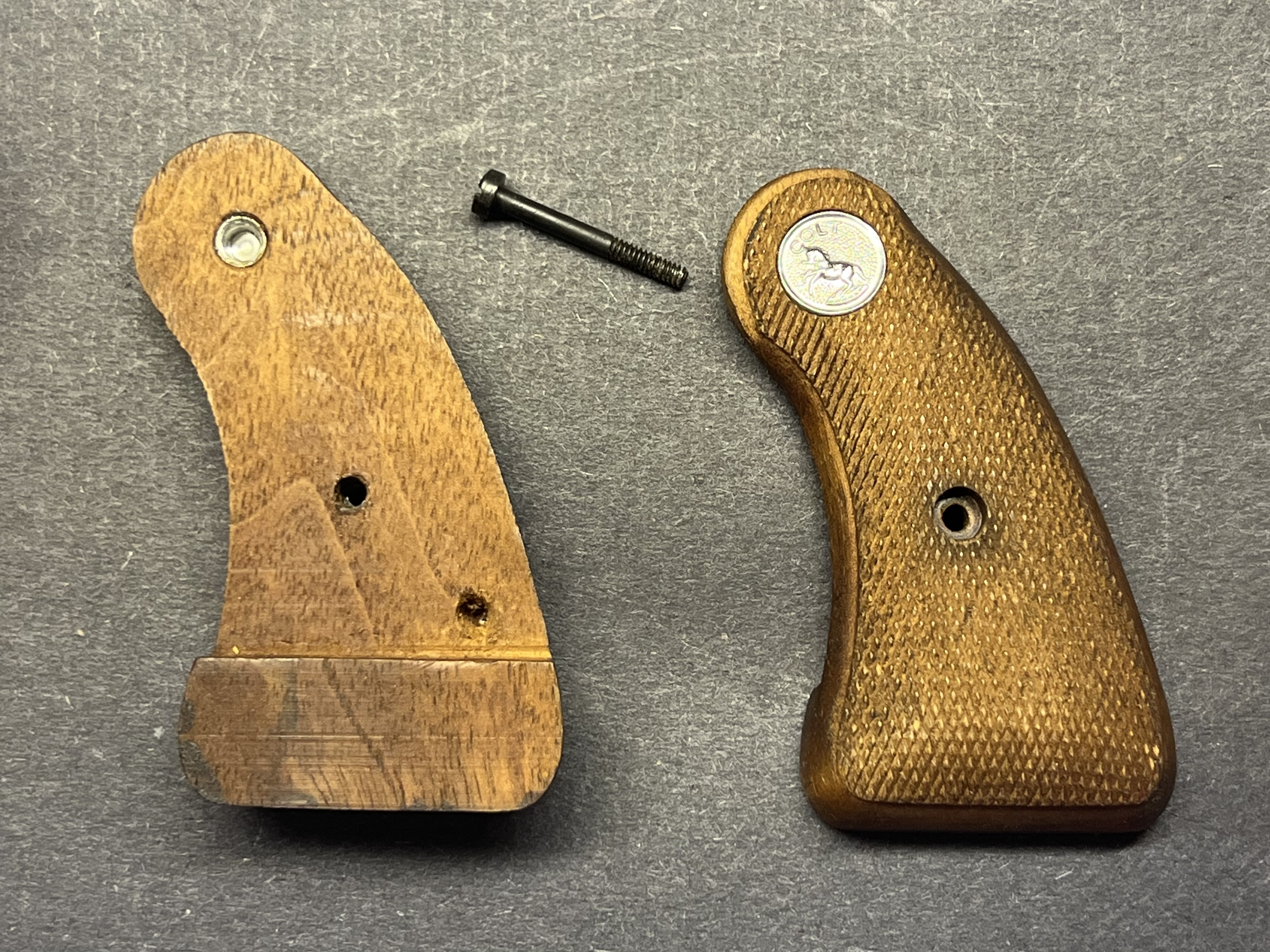 そこでブリットで使われたダイアモンドバックのグリップは本当に短いのか? 1966年以降のディテクティブのグリップを同じ角度で写真を撮ってみました。 メダリオンとグリップエンドの中間にスクリューが見えますが、私にはほとんど同じ位置に見えるのですが皆さんはいかがでしょう? 私は普通のサイズではないかと思います。 | |