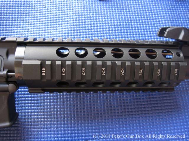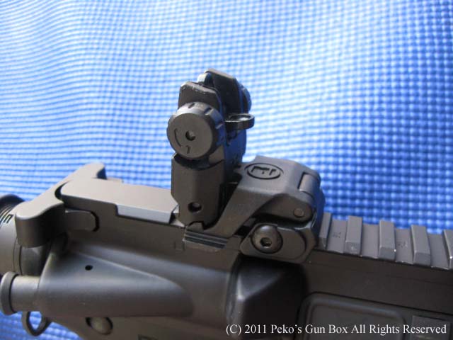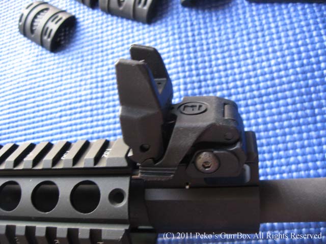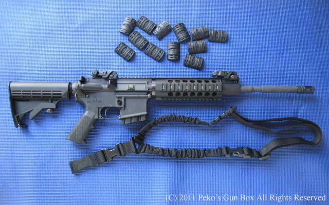 銃自体は皆さんよくご存知のAR15ですのでいまさら説明するまでもないですが、レールになっているハンドガードはフロントのガスブロックには触っていないフルフローティング・バレルになっています。 フロントとリヤのバックアップ・サイトはどう見てもマグプルのコピー品ですね!(笑) ガンショーでは友人と二人で2丁買ったので「2丁買うから安くならんのか?」と聞いたら、ワンポイント・スリングとレール・カバー、それに10発マガジンを付けてくれました。 もしかしたら最初から付いていたのかもしれませんが!(爆) まあキャッシュ・オンリーでセールス・タックス(消費税)なしということなので$700ちょうどは安いでしょう? 日本でタニコバのM4を買ったらこれぐらいは軽く越してしまいますよね! | |