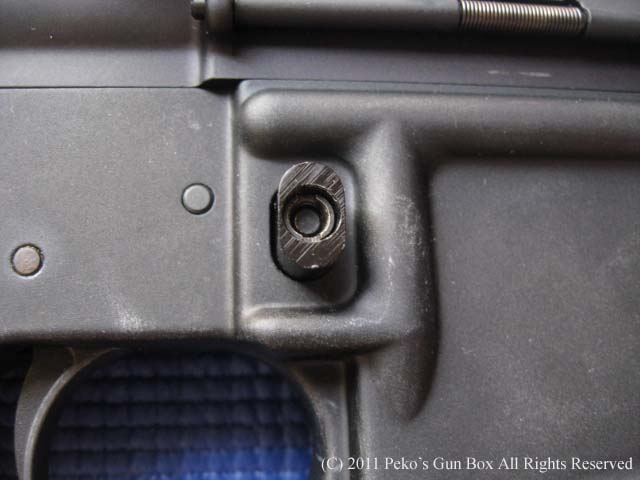 しかしこのライフル、普通のボタンに取り替えると簡単に元に戻ります。(笑) それはやってはいけないことなのでしょうが、アメリカ人の友人に聞いてみたら「ああ、一応そういう事になってるね!笑」程度の返事が返ってきました。(笑) ガンショーの出店ではこのマグキャッチの穴にはめ込むボタンが売られていてはめ込む先が磁石になっていてそれをはめると普通にマガジンをはずせるようになります。 磁石ですので簡単に外れます。 本体には何も手を加えないので法律的には何も問題ないのです。(笑) まったくどうなっているのやら?! | |