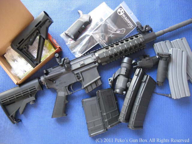 というわけで着せ替え用に揃えたのはこちら! マグプル CRT ストック、MIAD グリップと MOE トリガーガード、マグプル30連と10発しか入らない20連マグ(射撃用?)、バーチカルグリップにタクティカルライト/レーザーサイト、エイムポイント用マウント(エイムポイントは持っているので!)といったところでしょうか? | |