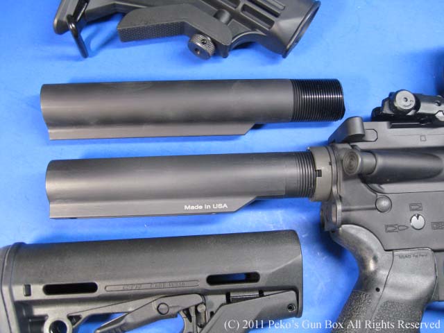 私は今まで知らなかったのですが、AR系のストックチューブはミル・スペック(ミリタリー・スペック)とコマーシャル・スペック(市販用)の2つのサイズがあってミル・スペックのほうが1mmほど直径が小さいのです。 CRTストックを買う際、2つのサイズがあることを知りミル・スペックの方を購入したのですが見事外れました!(笑) コルト・オリジナルはもちろんミル・スペックなのですが、何で2つのサイズがあるのか?とマグプルを扱っているところで聞いたら「どっかの馬鹿がちゃんと計らないで作ったから!」という予想通りの返事でした!(爆) というわけでチューブも購入した次第です。(私とした事が!) | |