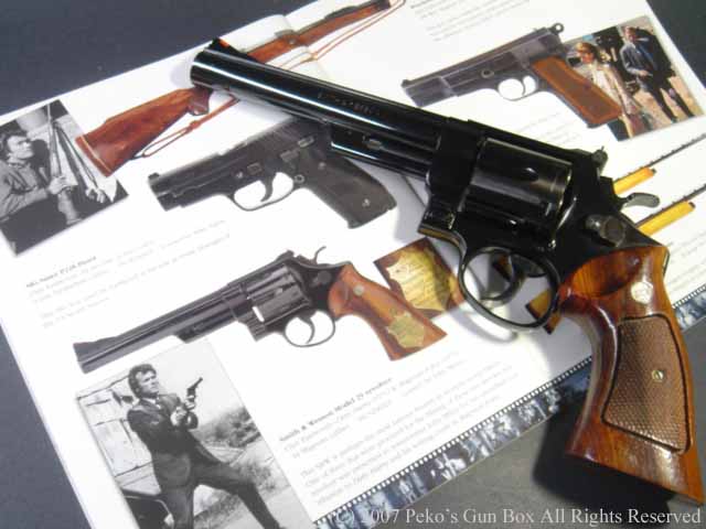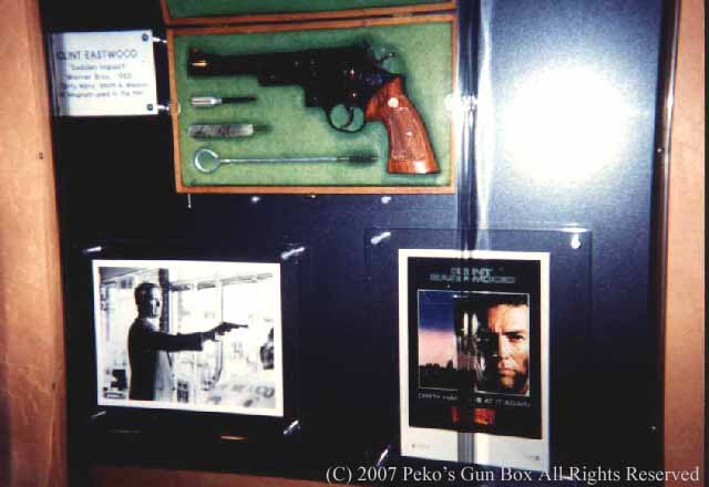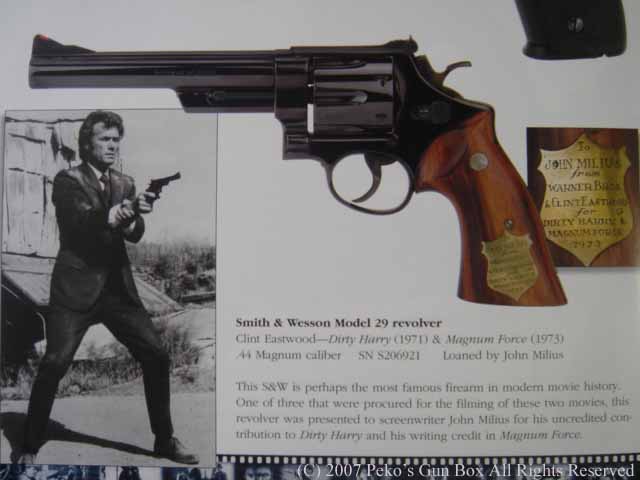 この写真のM29は、実際に映画で使われた物です。 1作目の「Dirty Harry」(1971)と2作目の「Magnum Force」(1973)で使用されたシリアルナンバー”S206921”のM29 6.5インチで、説明文によりますと 『おそらくS&Wのガンの中でもっとも映画史上で有名になった物ではないかと言えるこのガンは、1作目と2作目で使用された3丁のM29の内の1丁で、当時映画脚本に携わったジョン・ミリアス氏に贈られた物です。』 とあります。 この3丁という数に私はちょっと引っかかるのですが、普通は2丁用意される物なので、1作目のガンはM57と1丁ずつだったのでは?と思われます。 | |