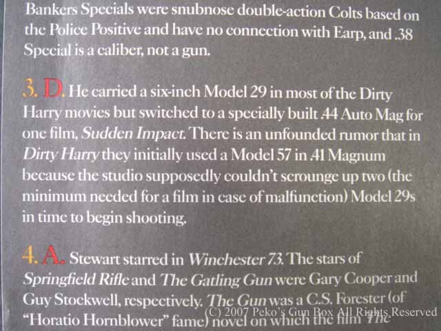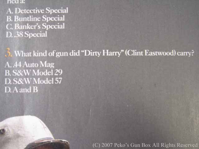 これはもちろん皆さんご存知、Smith & WessonのM29なのですが、M29は1作目の「Dirty Harry」、2作目の「Magnum Force」、3作目の「Enforcer」と使われ4作目の「Sudden Impact」でM29と一緒に特別に映画用に作られた44オートマグ「クリント1」が登場するのは皆さんご存知ですね。 しかし、その質問の答えは、BのM57で、1作目の映画を撮る時に普通2丁の同じガンをそろえて1丁はバック・アップ用に(もう1丁が調子が悪い時の為)するわけですが、当時M29は1丁しか見つからず、もう1丁は41マグナムのM57が使われたらしい!ということなのです。 M29とM57は外寸は同じ物でよっぽど銃口のアップでもない限りスクリーンの中では見分けがつかないですね。 この話は何年も前に神戸I.M.F.さんと話題にしたことがありました。 その時も憶測だけで手がかりはつかめなかったのですけどね。 | |