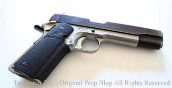 | もう1つ、冒頭の酒場のシーンでシュワルツネッガーが服といっしょに奪い取る1911オートですが、これはコルト・コンバット・エリートとして紹介している人もいますが実際はこのガンもデトニクス社でサラのガンといっしょに製作されたようです。 | |