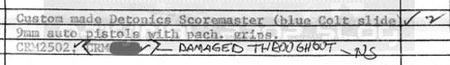 ![]() カスタム・メイド・デトニクス・スコアマスター(ブルー・コルト・スライド) 9mm オート・ピストル・ウィズ・パックマイヤー・グリップ 2丁目はダメージを受けて廃棄したとあります。 |
