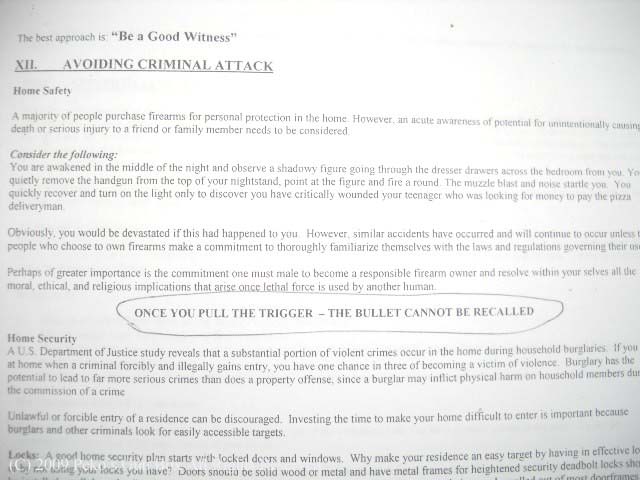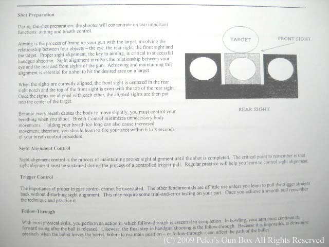 | まず許可を取るには8時間に及ぶ講習を受けなければなりません。 CCW 取得のための講習は月に2回、行きつけのガンショップで行われていますのでショップへ行って次の講習会の予約を取ってきました。 講習には自分がキャリーするガンを持っていかなくてはなりません。 講習会は銃の扱い方から銃を使う際の法の解釈まで講義とビデオで8時間きっちりと行われました。 簡単なペーパー・テストの後、もって来たガンで実射テストです。 テストは3、5、7ヤードの各至近距離で右手から6発左手から6発、合計36発をマンターゲットのシルエットの中に打ち込めば合格です。 つまりガンを撃った事のある人なら簡単ということですね! | |
