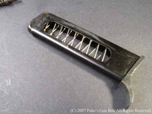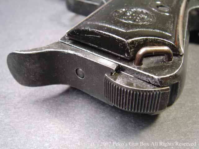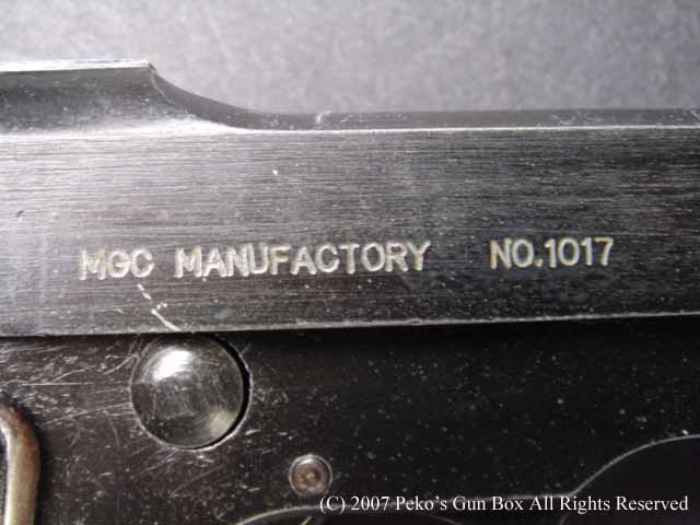 | MGCベレッタのフレームは、左右とも上下2つの穴が開いていてマガジンが見えるのですが、本物は上下がつながった1つの穴が開いています。 確かウェスタン・アームズのベレッタのモデルガンも2つ穴でした。 MGCのものをお手本にしたのでしょうか? もしくは強度を稼ぐ為かもしれませんね。 マガジンのフィンガー・レストは、軍用タイプは鉄板を折り曲げて作られていましたが、戦後モデルはこのMGCと同じようなものになりましたのでマガジンだけは戦後モデルということになります。 |