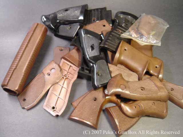 モデルガンはグリップ1つで見違えるようになりますね。 このベレッタはそんなに変わりませんが、木製グリップのガンは本物のグリップをつけるだけでまったく印象が変わってしまいます。 そんなはずしたグリップを実家で見つけたのでこちらへ送ってもらいました。 こんなものはもう使わないのですが、貧乏性のためか捨てられないのですよ!(笑) しかし、見る人によっては宝の山という人もいるみたいですけどね! | ||