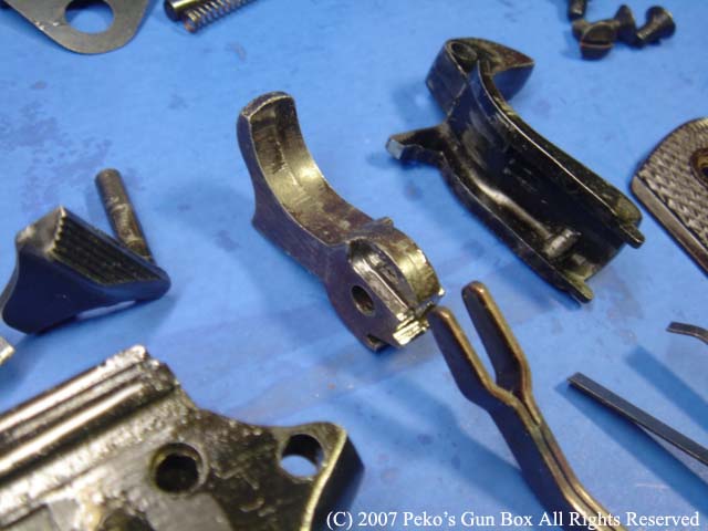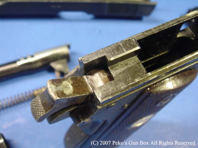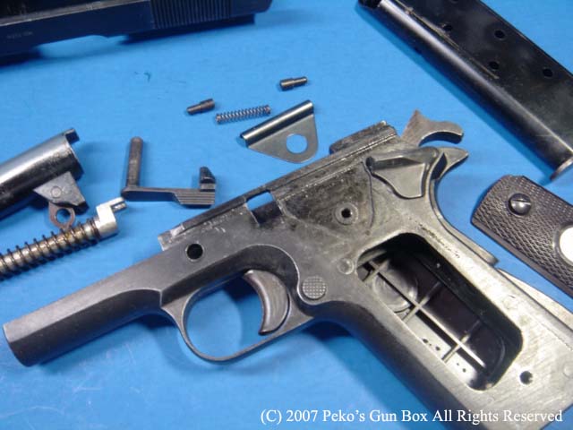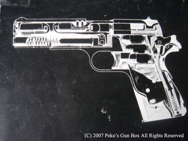 | 上の透視図はMGCの初期のカタログに載っていたものですが、このGM1をバラすまでパーツ形状が他のモデルガンや実銃と違っているので実態がわからなかったのでした。 | |