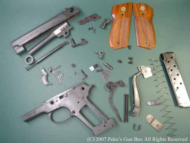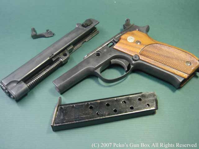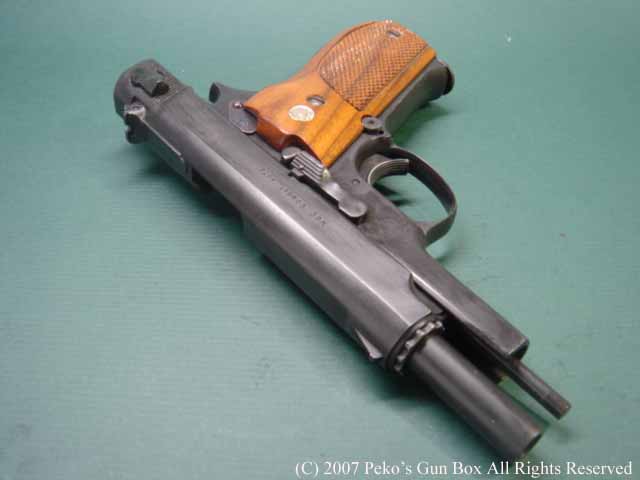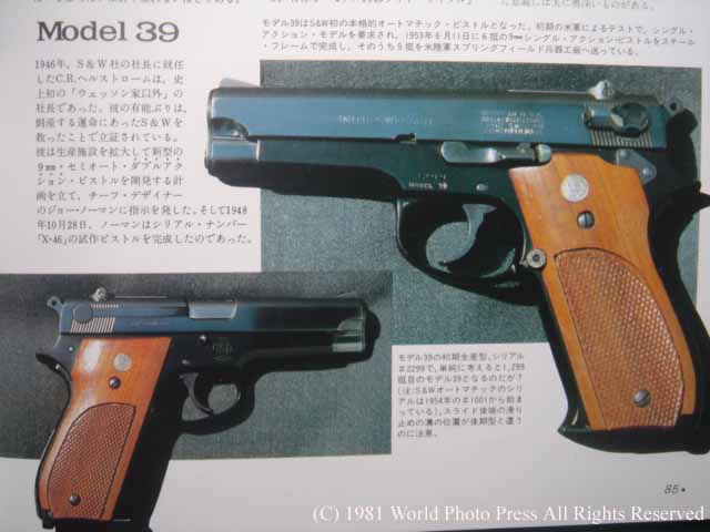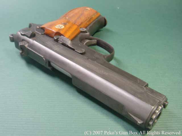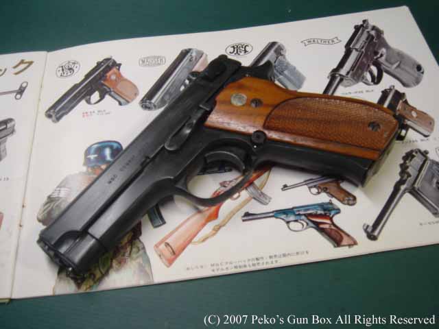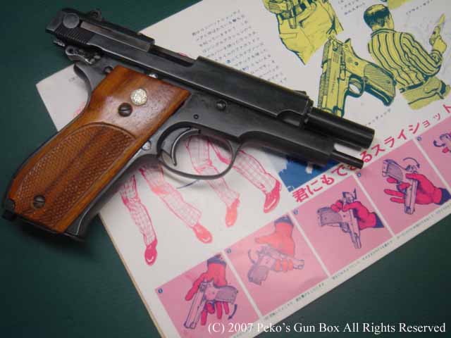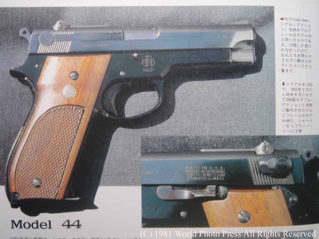 | それにしてもよくM39やM44を当時、取材できたものだと思います。 たぶん写真から図面を起こしたのだと思いますが、それにしてもS&Wオートの雰囲気をよく出していると思います。 グリップ・スクリューの位置は少しだけ上下の位置が広く、見てのとおり実銃のグリップと交換してありますが、ほんの少し穴をずらしてあります。 しかしM44なんてモデルがあったかどうかなど、アメリカ人でも知っている人は少ないのではないでしょうか? | |