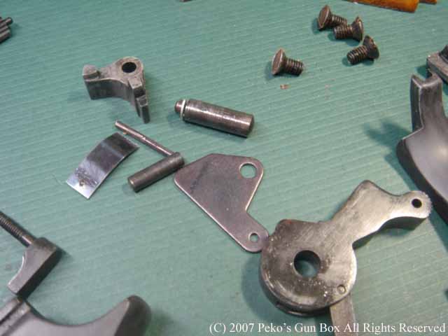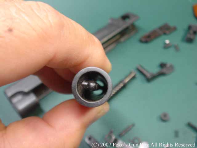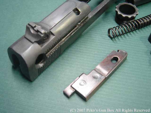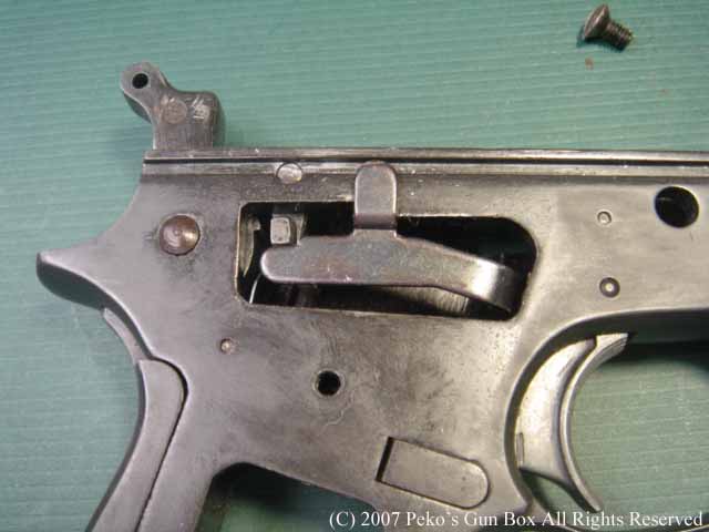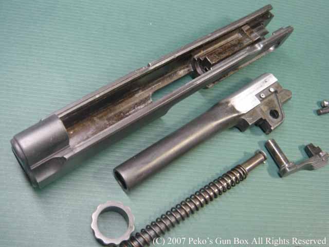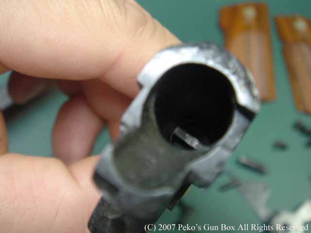 | 今回のトイガンボックスはMGCのSW/44オートを紹介します。 この44オートは輸出仕様の為、ブローバック・モデルではありません。 ハンマーやシアなどの主要パーツもロスト・ワックスではなく亜鉛合金製のパーツなのです。 それに、たぶん安全性を考慮してファイアリング・プレートはハンマーがあたる部分が短くされており、ハンマーが落ちても届かないようになっています。 輸出モデルは発火を目的とはしていなかったからでしょう。 バレルにはデトネーターはもちろん、前撃針も付いていません。 それに、エジェクターも入っていませんでした。(欠品なのかもしれませんが、、、) | |