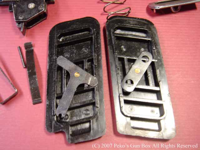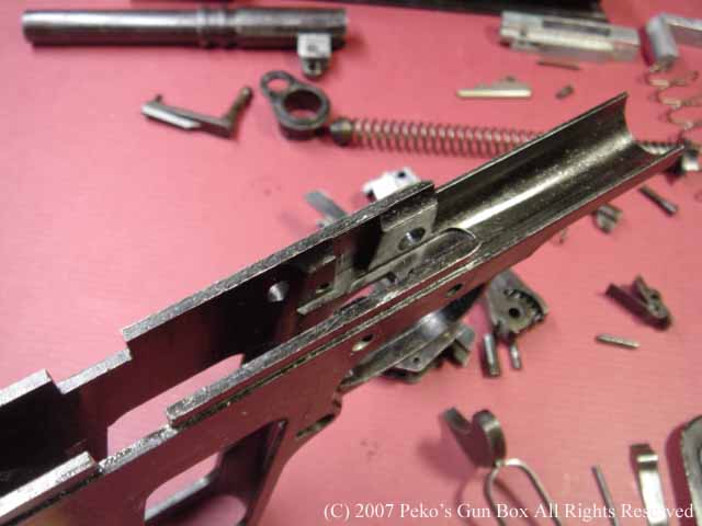 | 内部の構造はいたってシンプルです。 スライドストップを押さえているクリップをずらし、スライドストップを抜き取ります。 するとスライドが前へ抜けてガバメントと同じブローニング・スタイルのバレル・リンクが現れます。 ハンマーとシアーはセットになって取り出すことができ、クリーニングを簡単にしています。ナカタのトカレフには残念ながらディスコネクターは省略されていますが、実物のシンプルな作りをよく再現していると思います。 | |